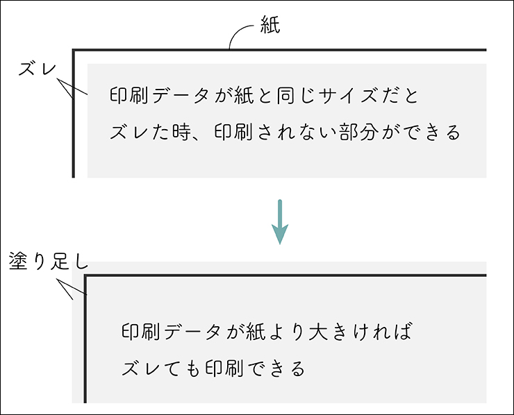この誤差の分を見越して少し大きめに印刷データを作っておくのが、塗り足しという部分です(図7)。こうすることで、誤差が生じても何も印刷されていないということを防ぐことができます。