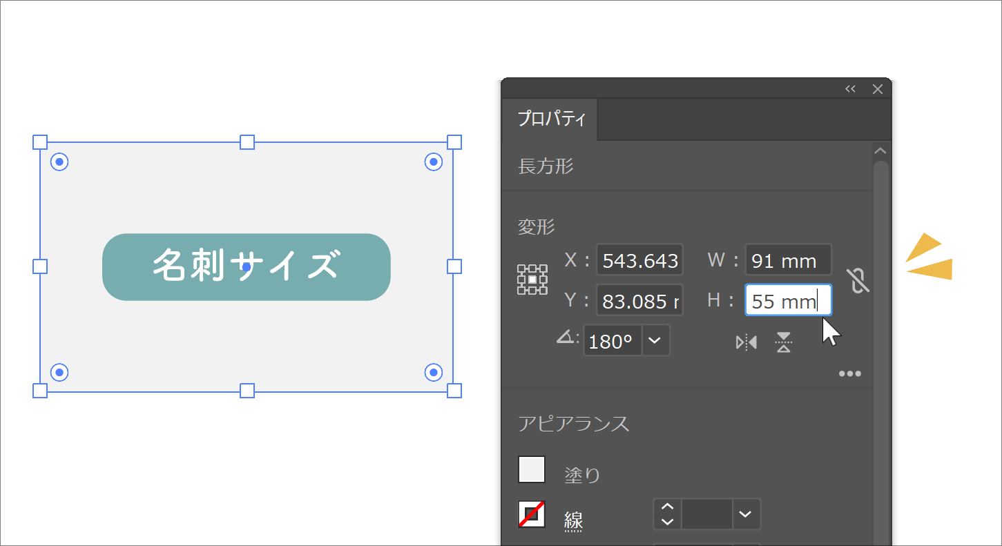 プロパティパネルの[W]でオブジェクトの幅、[H]でオブジェクトの高さを設定して任意のサイズにします(図1)(図2)。たとえばA4サイズなら「210 × 297mm」、名刺サイズなら「55 × 91mm」などを入力すればOK。