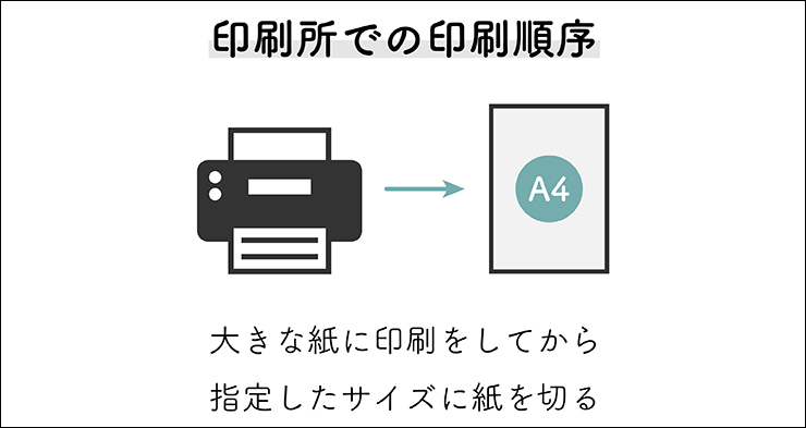 しかし、印刷会社では大量の紙をまとめて印刷する必要があるので、大きな紙に印刷をした後に、指定したサイズに紙を切り分けます。つまり、家庭でのプリントとは順序が逆になります(図6)。