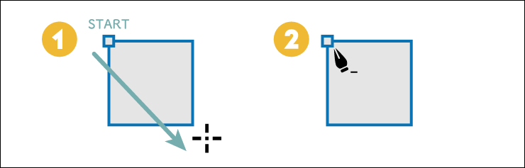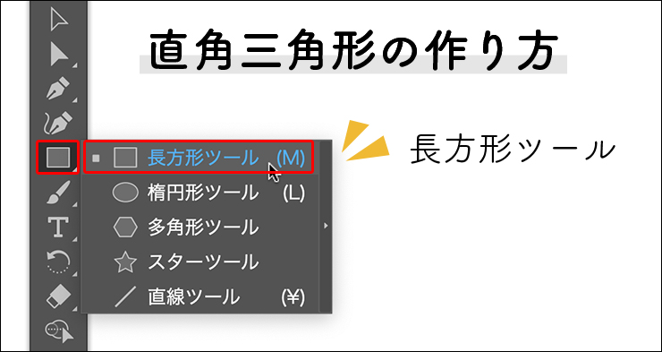 直角三角形を作るには、「長方形ツール」を使う方法が効率的です。長方形ツールを選んで(図3)、アートボード上をドラッグして四角形を描いたら、「ペンツール」を選んで、いずれかの角のアンカーポイントにマウスポインターを合わせます。するとペンの先にマイナスがついたポインターに変化します(図4)。