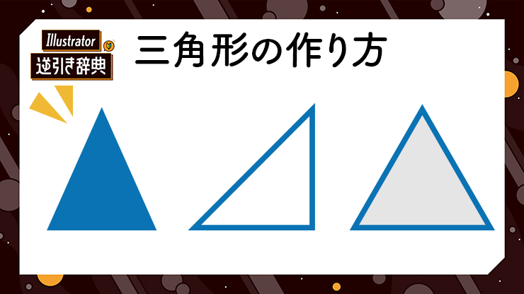 Illustrator(イラレ)で三角形を描く方法を説明します。三角形を作る専用のツールは用意されていませんが、「多角形ツール」や「長方形ツール」を利用すると簡単に作成可能です。ここでは、正三角形や直角三角形のような基本的な形状の作り方と、それをアレンジする方法を紹介します。