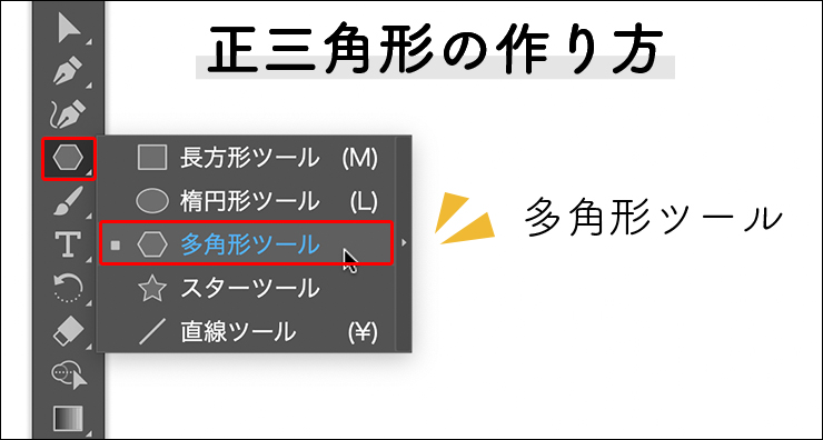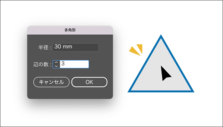 なお、多角形ツールを選んだ状態でアートボード上をドラッグしているときに「↑(上矢印)キー」を押すとそのたびに角が1つ増え、「↓(下矢印)キー」を押すと角が1つ減ります。角が3つより少ない多角形は存在しないため、「↓キー」を押しっぱなしにすると必ず最終的に三角になります。より直感的に正三角形を描きたいときに便利な方法です。