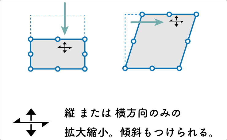 マウスポインターを四辺の中央にあるハンドルに合わせると、垂直の矢印と水平の矢印が組み合わさった形に変化します。その状態でドラッグすると、選択している辺を垂直または水平方向に動かすことが可能です。