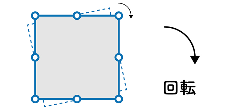 オブジェクトの四隅のハンドルにマウスポインターを合わせると、ポインターが曲線の矢印と斜めの矢印を組み合わせたような形に変化します。そのままドラッグすることで拡大・縮小や回転が行えます(図6)。