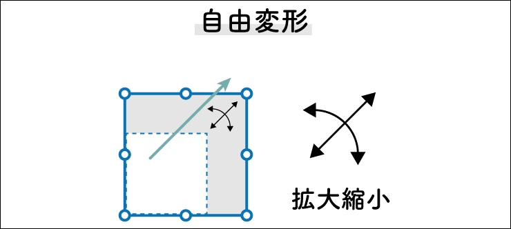 自由変形ツールのオプションのうち、[自由変形]を使うとオブジェクトを拡大・縮小したり、回転することができます。