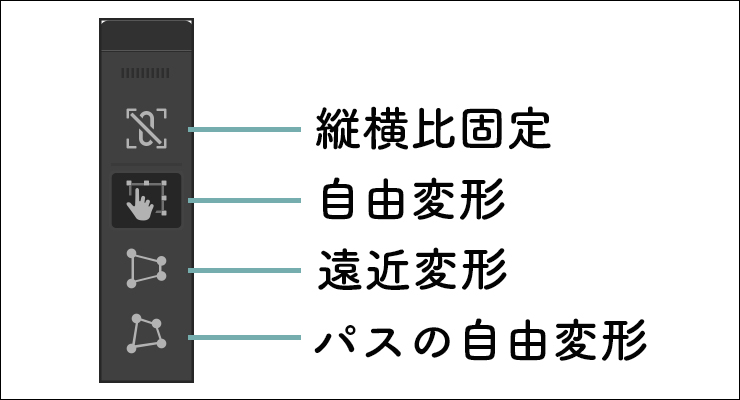 ウィジェットは上から順に[縦横比固定][自由変形][遠近変形][パスの自由変形]となっており、目的にあったオプションを選ぶことで思い通りにオブジェクトを変形することができます(図3)。