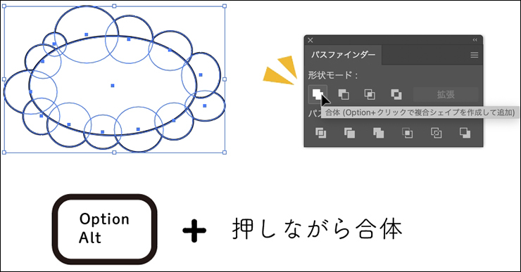 続いて、描いた楕円をすべて選択したあと、optionキー(Macの場合。WindowsではAltキー)を押しながらパスファインダーパネルの[形状モード:合体]をクリックします(図8)。