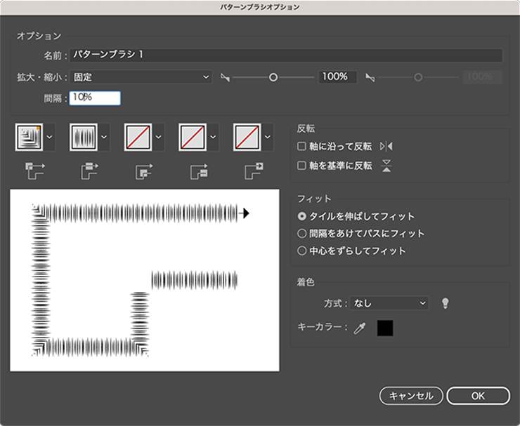 「新規ブラシ」ダイアログが表示されるので、[新規ブラシの種類を選択:パターンブラシ]を選び、「パターンブラシオプション」ダイアログで[間隔:10%]に設定して[OK]をクリックして登録します(図26)。