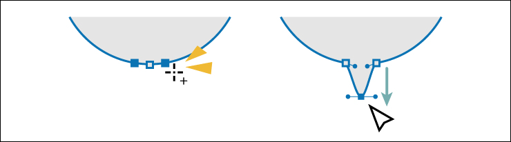 続いて、ペンツールで、楕円の一番下のアンカーポイントの両脇をクリックして、2つのアンカーポイントを追加します。あとは、ダイレクト選択ツールで、この3つ並んだアンカーポイントのうち、真ん中をドラッグして外側に動かします(図4)。