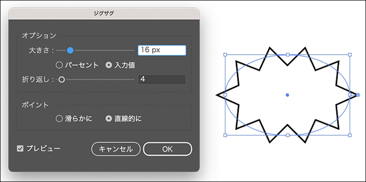 「ジグザグ」ダイアログが表示されるので、[プレビュー]にチェックを入れて、[ポイント:直線的に]を選択。プレビューを確認しながら[大きさ]や[折り返し]を入力して形を整えます(図15)。