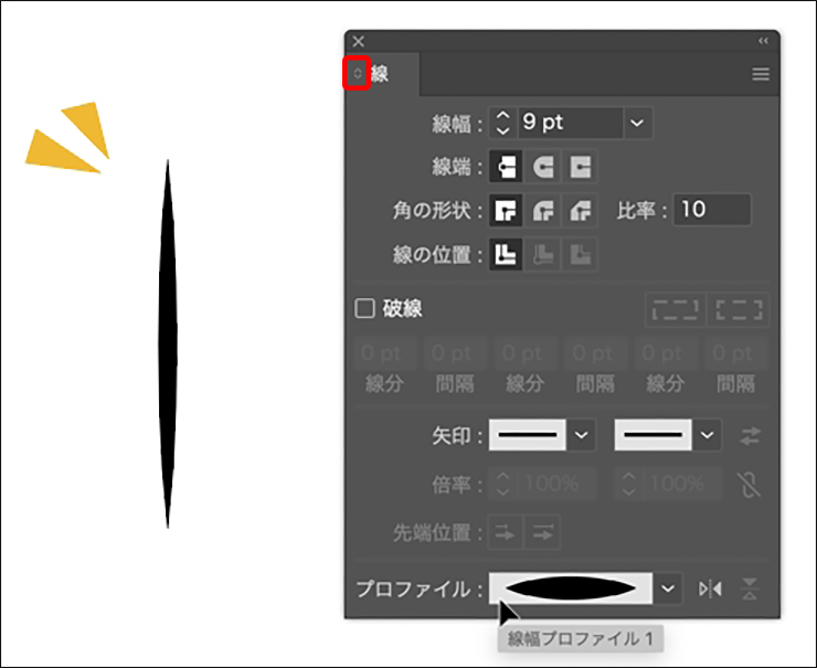 続いて、ウィンドウメニュー→“線”を選んで線パネルを表示させ、先ほど描いた縦線を選択して、線パネルを[プロファイル:線幅プロファイル 1]に設定します(図21)。