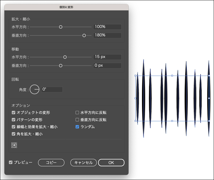 できた縦線をすべて選択して、オブジェクトメニュー→“変形”→“個別に変形...”を選び、[プレビュー]と[ランダム]にチェックを入れ、[拡大・縮小]の[垂直方向]と、[移動]の[水平方向]の数値を調整します。