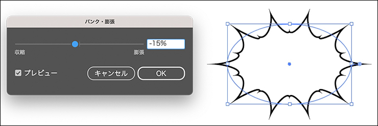 続いて、効果メニュー→“パスの変形”→“パンク・膨張...”を選び、[プレビュー]にチェックを入れてプレビューを確認しながらスライダーを動かし、好みの形に整えたら完成です(図16)。