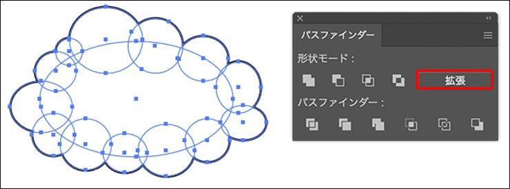 複合シェイプを細かく調整してイメージ通りのふわふわした形になったら、複合シェイプを選択した状態でパスファインダーパネルの[拡張]をクリックすると(図11)、複合シェイプの状態を終わらせて単一のオブジェクトにすることができます(図12)。