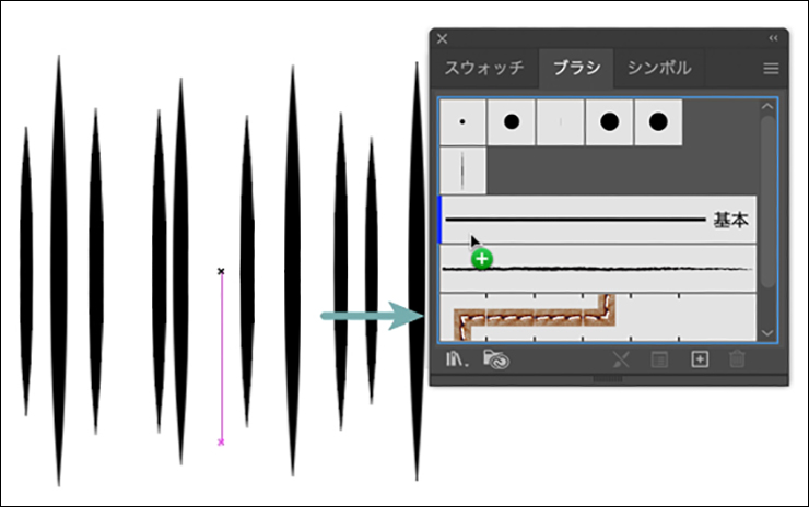 次にウィンドウメニュー→“ブラシ”を選んでブラシパネルを表示させ、縦線をすべて選択した状態でブラシパネル上にドラッグ&ドロップします(図25)。