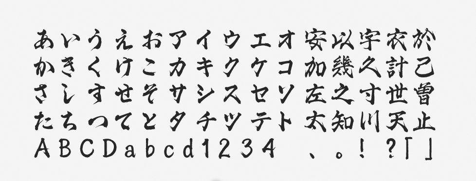 「ふところ」がしっかり確保されているため、勢いがありながらも読みやすい珍しいタイプのフォントです。筆書系ならではのしっかりとした“黒み”も特徴で、強いインパクトを出す目的でも役立ちます。
