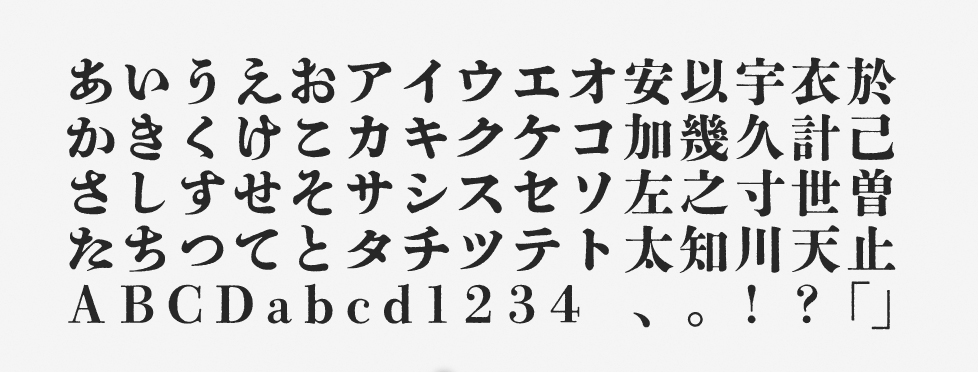 ひらがなには太い筆で書かれたような力強いうねりがあり、クセの強さや重量感を与えつつ、見出しなどをしっかり強調できます。かな、漢字、英数字があらかじめ揃えられているため、合成フォントの作成の手間もかからずにスムーズに使えて便利です。