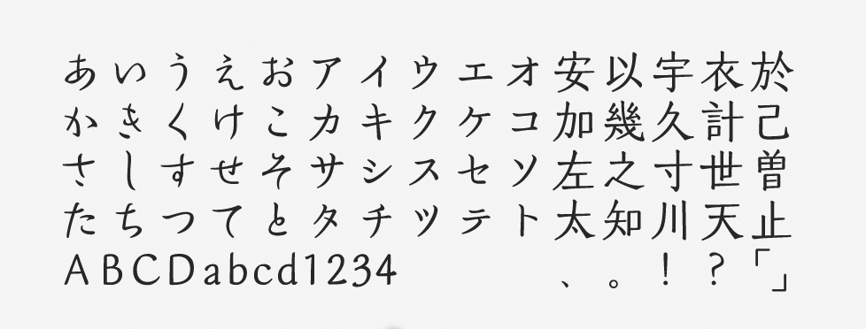 ふところを絞った骨格と、やわらかくて現代的なエレメントで構成された明朝体風のデザインフォントです。全体的にはすっきりとした印象で、和モダンな印象を表現したい場合にも適しています。