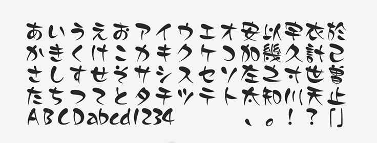 縦画と横画の太さのコントラストは非常に高く、水彩の平筆で書いたような印象を与えます。ハネやハライの動きも強く、リズミカルな楽しい演出をしたいときに効果を発揮しやすいでしょう。丸い点のアクセントなども楽しく、明るいイメージのフォントです。