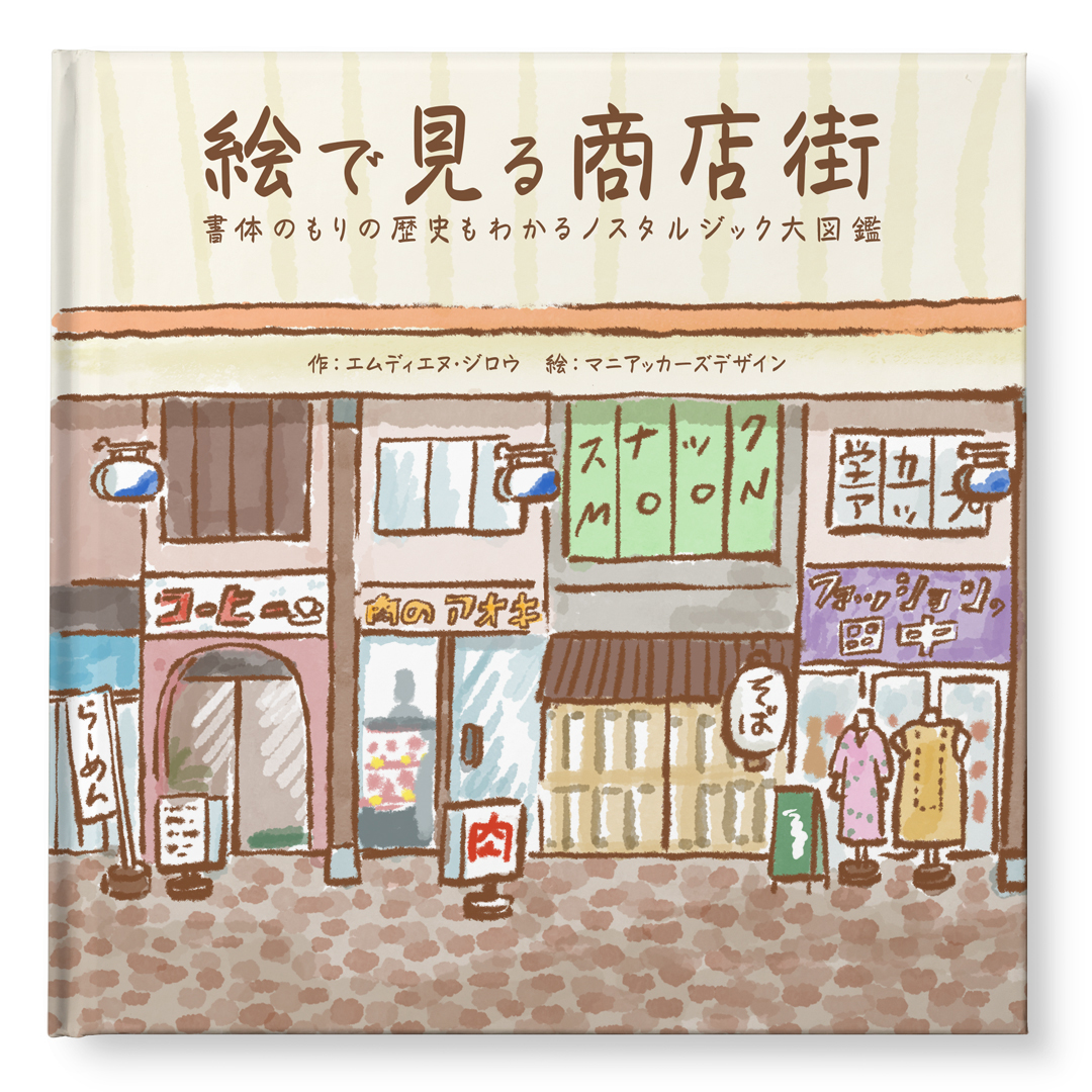 作例は商店街の歴史を題材とした絵本の表紙で、素朴なタッチのイラストにぺんぱるの文字を組み合わせて優しい温かみを表現しています。ぺんぱるは読者に親しみやすさを感じてもらうためにはとても効果的なフォントです。
