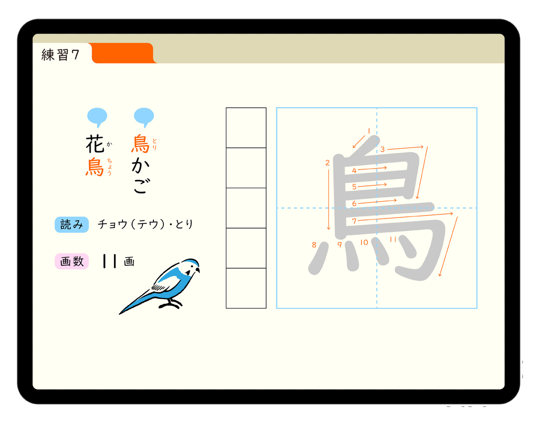 従来の一般的な教科書体とゴシック体のウイークポイントが両方カバーされ、現代の教育の現場に最適なフォントです。作例はiPadで表示する教材を想定しています。文字の線を書く方向も分かりやすく、まさにデジタル時代の新しい教科書体といった印象です。