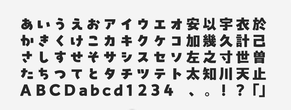 かな文字は愛嬌があって遊び心が含まれたデザインですが、全体的に不真面目な印象は与えません。スクエアで安定感のある漢字が組み合わせられている絶妙のバランスです。かな文字の字面が小さめに設計されていて、読みやすさも特徴的なフォントとなっています。