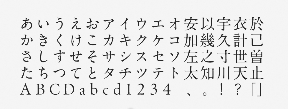 A1明朝はオールドスタイルの明朝体で、かな文字の字面は小ぶりに設計されています。画線が交差する部分や先端で、写植に見られた “墨だまり” が再現されていることも特徴です。アナログ感やレトロな雰囲気を漂わせ、漢字のゆったりとしたカーブも相まって独特な味わいを感じさせます。