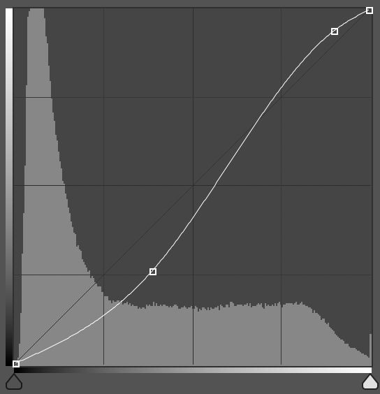 コントラストを上げたい場合は、トーンカーブのハイライト側とシャドウ側の2箇所にそれぞれポイントを作って、S字になるようカーブさせると良いでしょう(図8)(図9)。誤ってコントロールポイントを作ってしまった場合はCommandキーを押しながらクリックすると削除することができます。