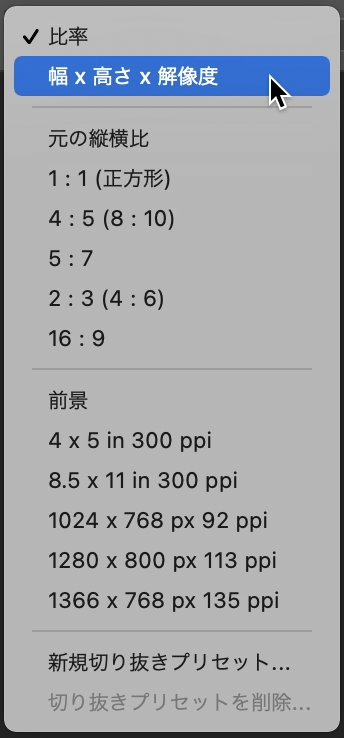次にツールパネルの切り抜きツールを選択(図2)。上部のオプションバーの「縦横比のプリセットまたは切り抜きサイズを選択」(図3)のプルダウンからは、一般的にさまざまな場面で活用されている比率やサイズのプリセットを選択することができるので任意の項目を選択します(図4)。