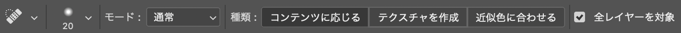 新規レイヤーを作成してスポット修復ブラシツールを選択して(図2)、オプションバーでブラシサイズを適宜電線のサイズによって調整し、[全レイヤーを対象]にチェックを入れます(図3)。