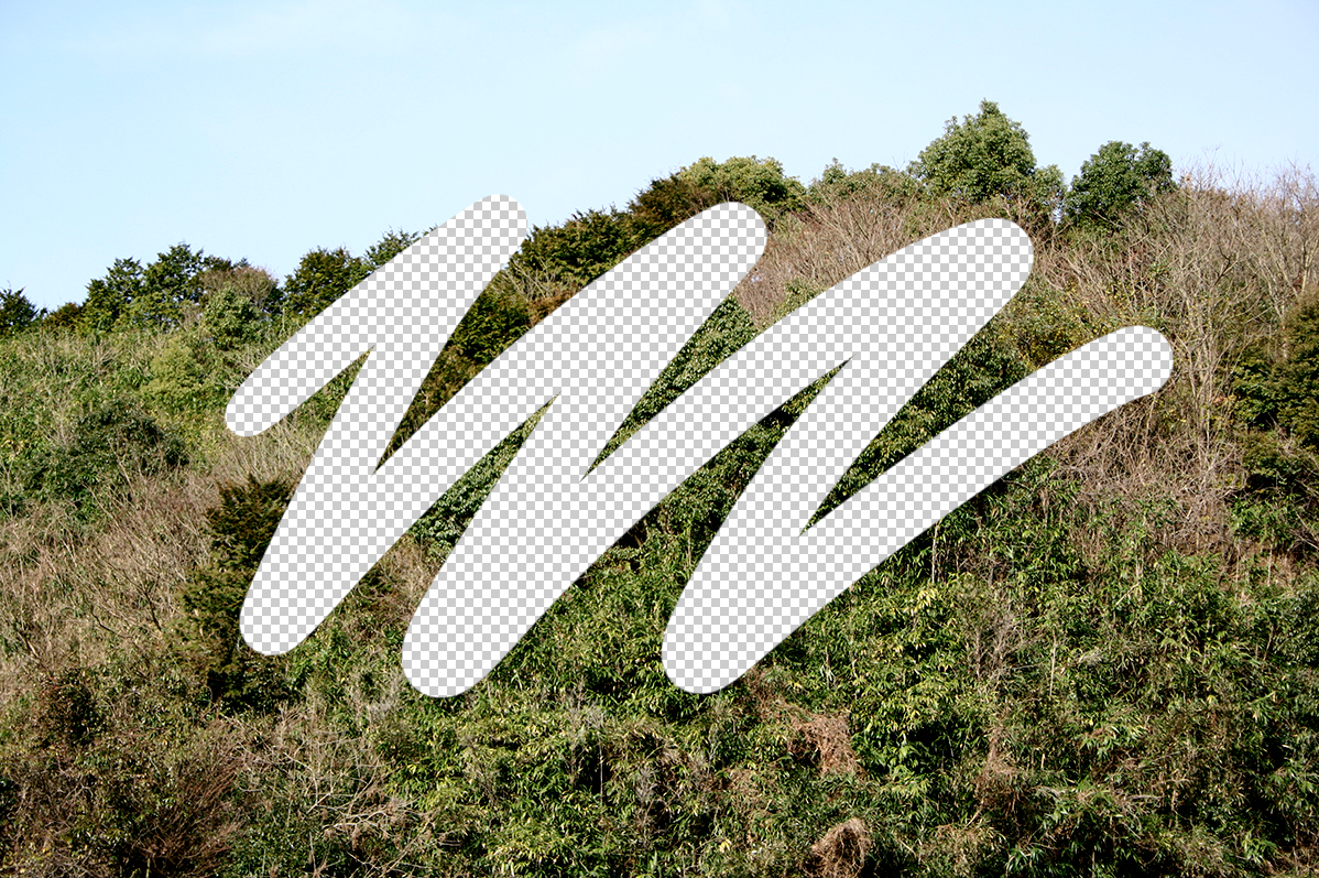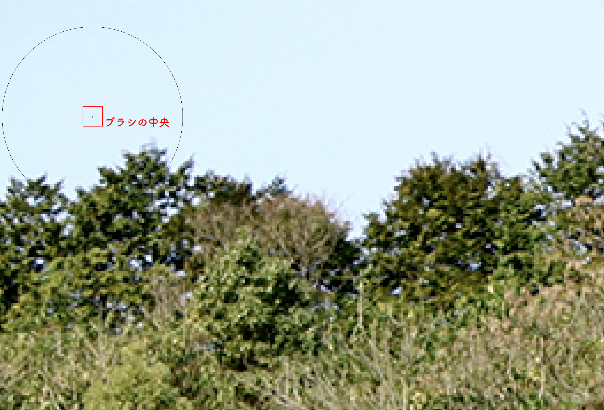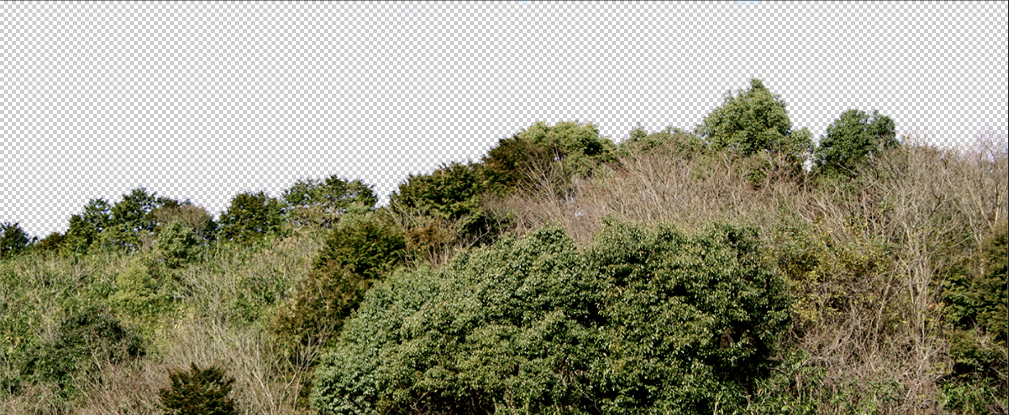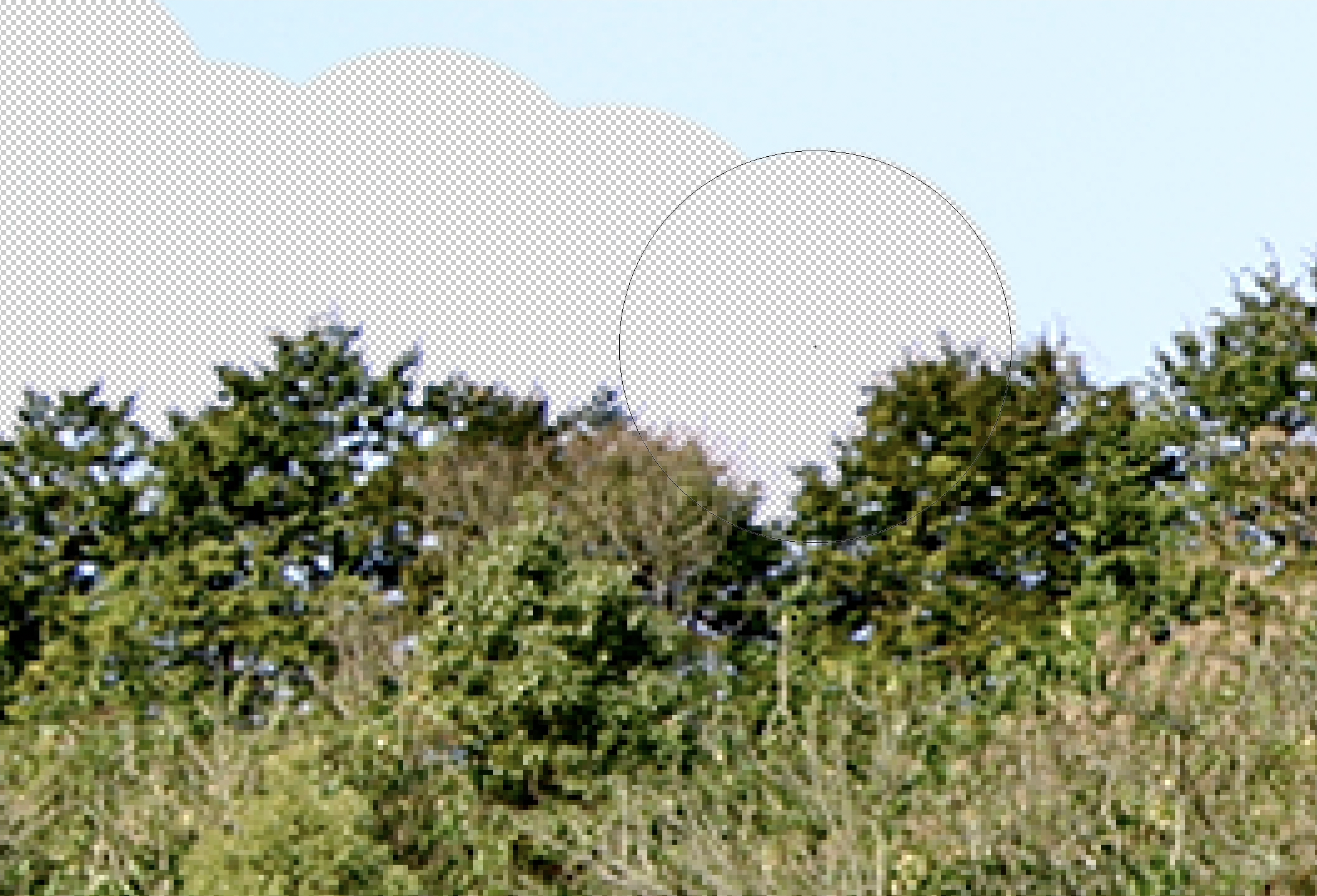 「背景消しゴムツール」はドラッグした部分を透明のピクセルに変換するツールです。エッジの消去に役立ちます。ブラシの中央の色を抽出してブラシ内の近い色を削除します。ここでは、ブラシの中央は空の色を抽出しているので(図6)、ドラッグしても草木の部分は削除されません(図7)(図8)。
