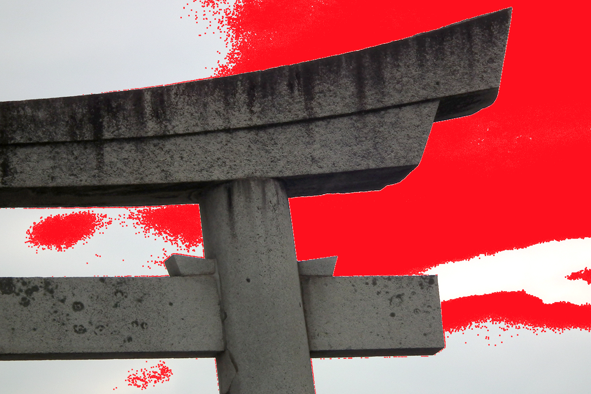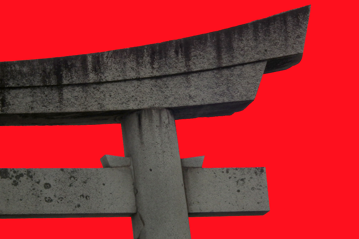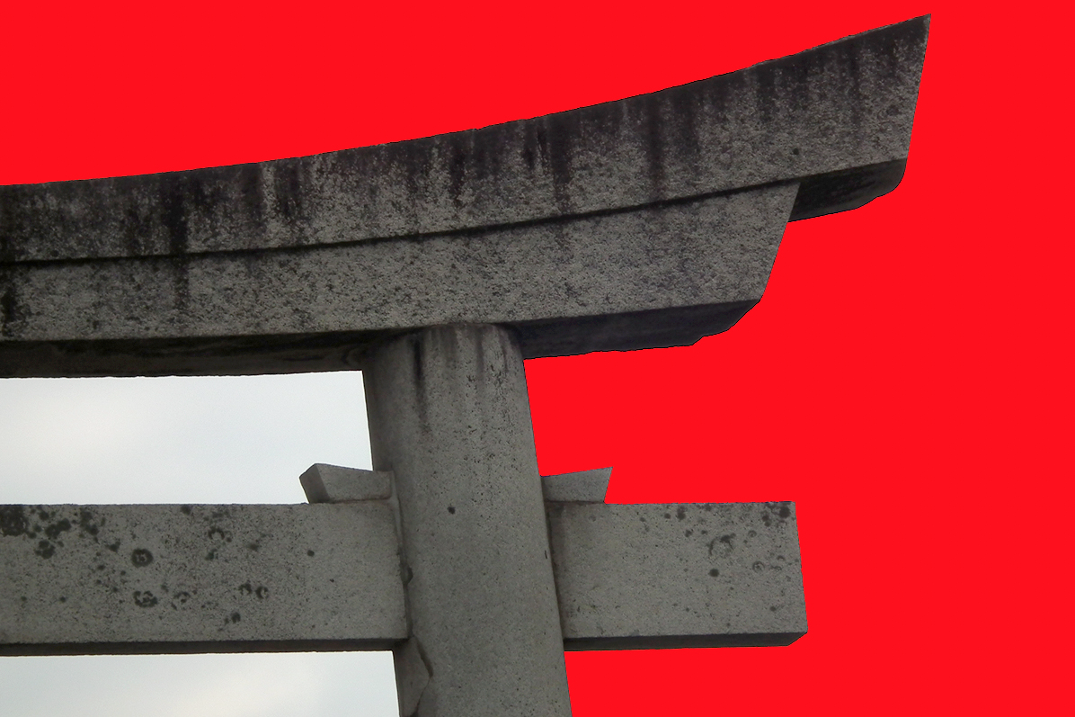 マジック消しゴムツールを選択して、[許容値:10]に設定して背景をクリックした画像(図11)と、[許容値:50]に設定して背景部分をクリックした画像(図12)。消去する範囲が広がり、鳥居以外の部分が透明ピクセルになったことが分かります。 ※背景色は変化が分かりやすいように赤で塗りつぶしています。赤色の部分が透明ピクセルの状態。