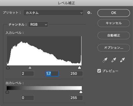 「レベル補正」機能で補正することもできます。先ほどと同様の写真を開いたら、イメージメニュー→“色調補正”→“レベル補正...”を選択し、(図4)のように設定。画像のシャドウ、中間調、ハイライトをそれぞれ設定できるので、スライダーを調整して明るさを補正します。ここでは、シャドウやハイライトはあまり動かさずに中間調を主に調整。調整を行う際はプレビューにチェックを入れた状態で写真の状態を見ながら補正しましょう(図5)。