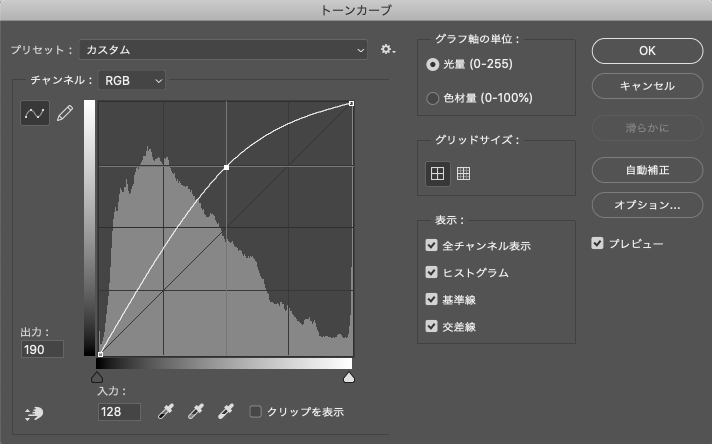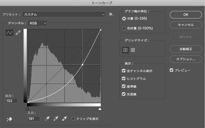 「トーンカーブ」機能を使えば上記で紹介した「明るさ・コントラスト」「シャドウ・中間調・ハイライト」を感覚的に同時に調整することができます。
