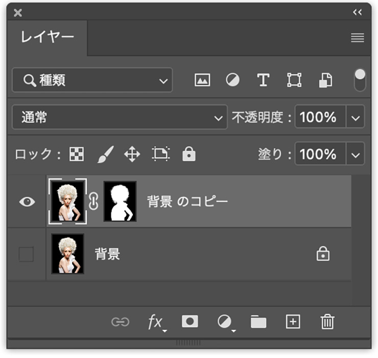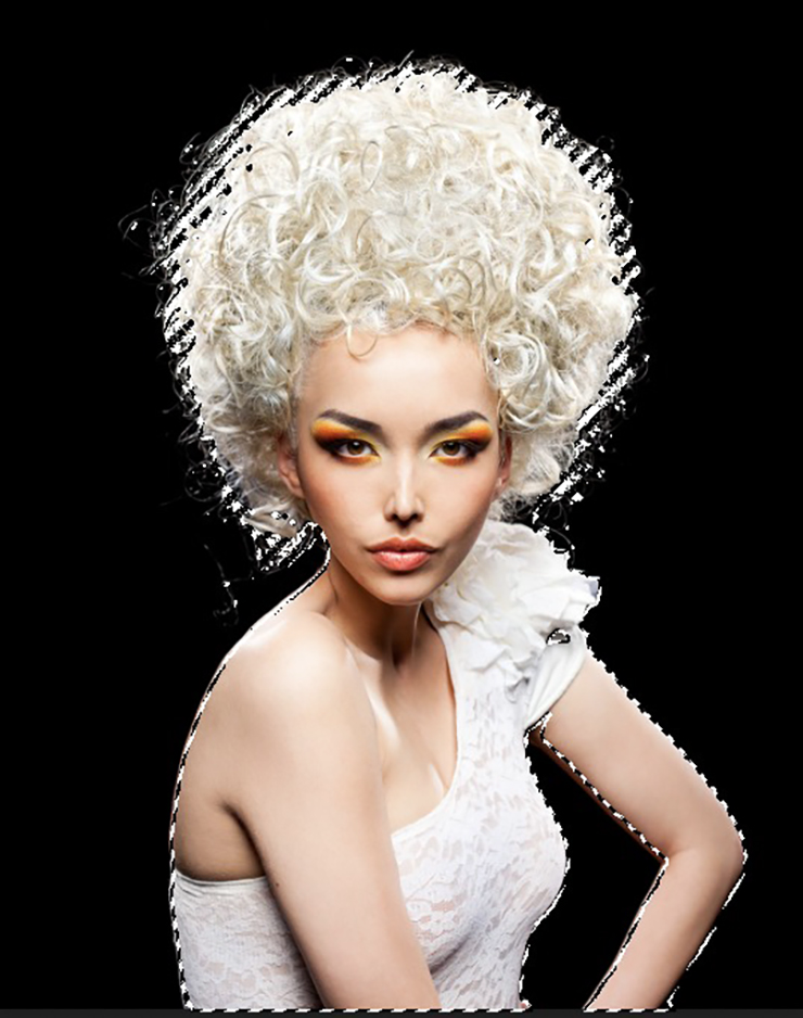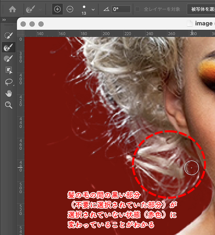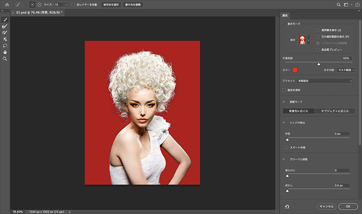 被写体は選択されましたが、髪の毛のエッジを見ると、選択範囲がまだまだ大ざっぱです。以下で細部の選択範囲の調整を施します。