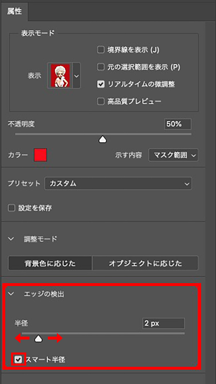 引き続きマスクワークスペース画面のままで、今度は、右側の属性パネルの「エッジの検出」の「スマート半径」にチェックを入れ、画像を見ながら「半径」のサイズを調整していきます(図9)。境界線をシャープにしたい場合は「半径」を小さく、境界線をソフトにしたい場合は「半径」を大きくします。