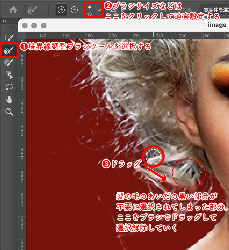 続いて、左側のブラシのアイコンから「境界線調整ブラシツール」を選択し、不要に選択されてしまった部分(髪の毛のあいだなど)をドラッグします(図5)。すると髪の毛のあいだの黒色だった部分が赤色になり、選択範囲を解除できます(図6)。
