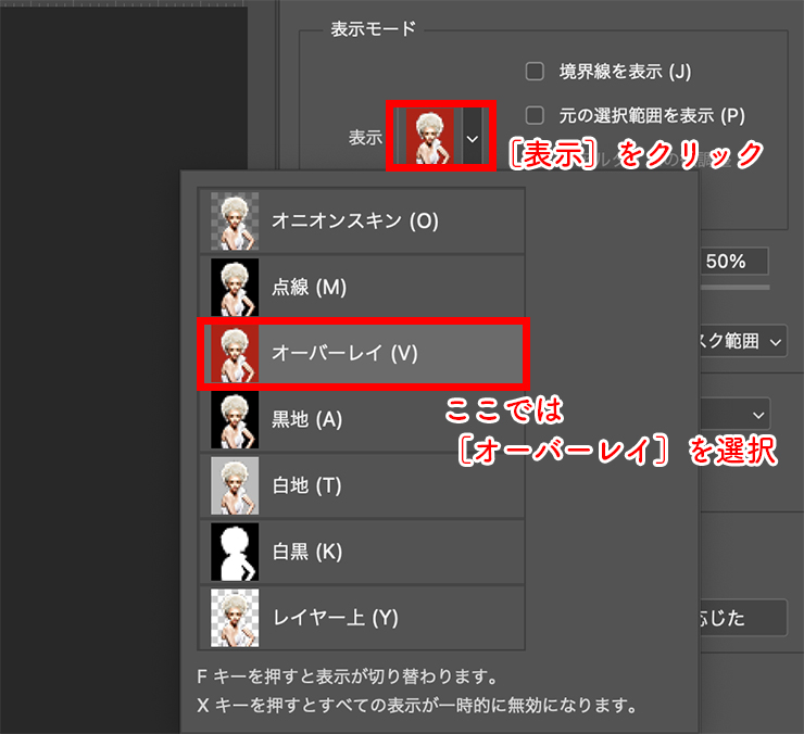 次に毛先など細部の選択範囲を調整していきます。被写体の選択範囲を作成した状態のままで、選択範囲メニュー→“選択とマスク...”を選択して、マスクワークスペース画面を表示します。ここでは、選択範囲を分かりやすく確認するため、「表示:オーバーレイ」にして、選択してない領域を赤色表示にします(図3)(図4)。