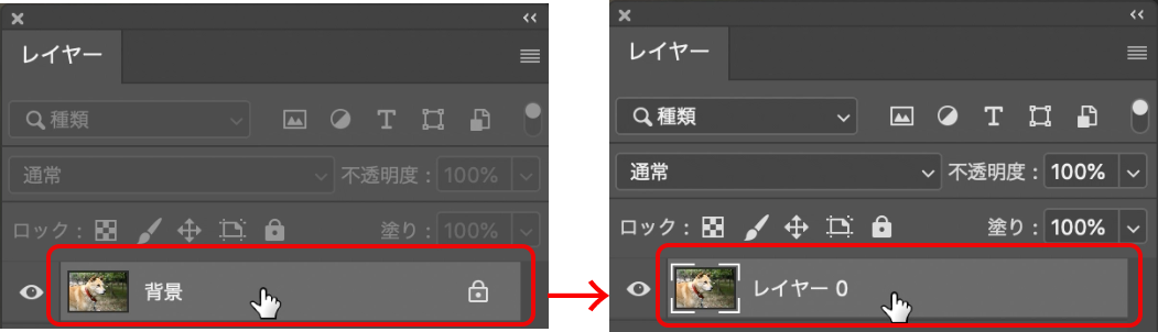 Photoshopで画像を丸の形(楕円形)に切り抜きます。画像をPhotoshopで開いたら(図1)、まずはレイヤーパネルの背景レイヤーをダブルクリックし、背景レイヤーから標準レイヤーに変更します(図2)。