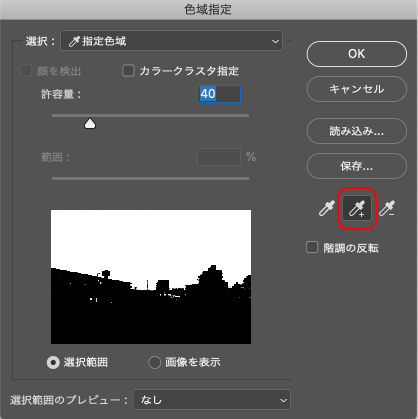 選択範囲メニュー→“色域指定...”を選択。ポインターがスポイトのアイコンに変わるので、スポイトを[サンプルに追加]に設定して、スポイトで画像内の空の色を選択していきます。この時プレビュー画像の空以外の部分が、できるだけ黒になるように設定しましょう(図13)。