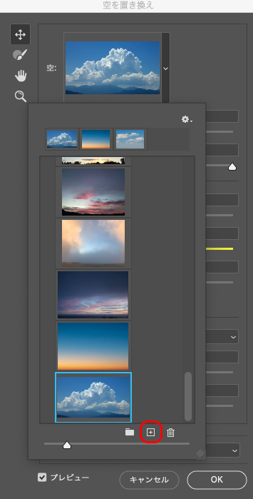 [空]の画像は、自分で用意した画像も使用可能です。[空:空を新規作成](下側「+」のアイコン)をクリックし、追加したい画像を選択(図6)。これで自分で用意した空に自動的に置き換わります(図7)。
