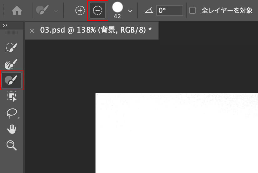 次に、選択範囲メニュー→“選択とマスク...”を選択。[表示モード:白黒]、ツールは[ブラシツール]、オプションバーの[削除]を選択して(図14)、適宜ブラシサイズを変更しながら不要な選択範囲を削除して、空だけを選択している状態に調整します(図15)(図16)。