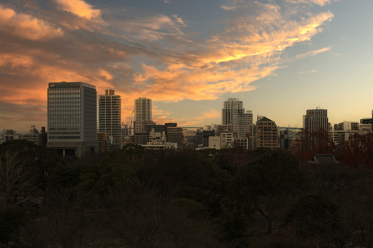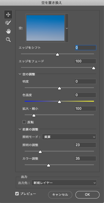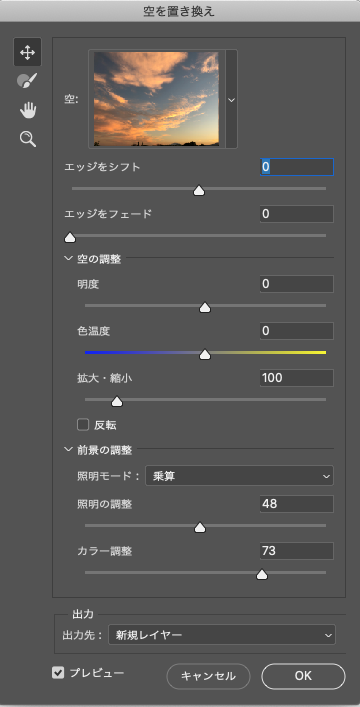 ここではさらに[空]のプリセットから夕暮れの画像を選択し、下図(図4)のように各種設定を調整しました。ワンクリックで曇り空がきれいな夕晴れになったことがわかります(図5)。