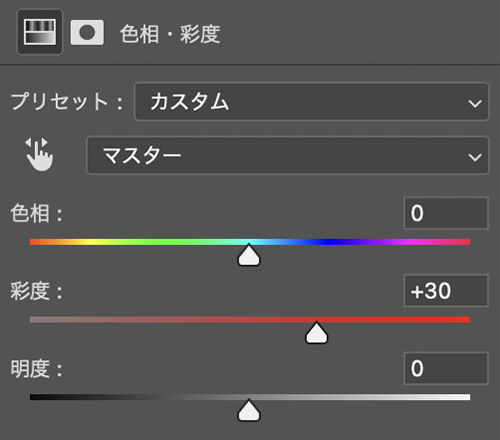 続いてレイヤーメニュー→“新規調整レイヤー”→“色相・彩度...”を選択し、[彩度:+30]に設定して彩度を上げます(図5)。選択範囲を作っていたので、唇の部分にはレイヤーマスクがかかった状態となります(図6)(図7)。