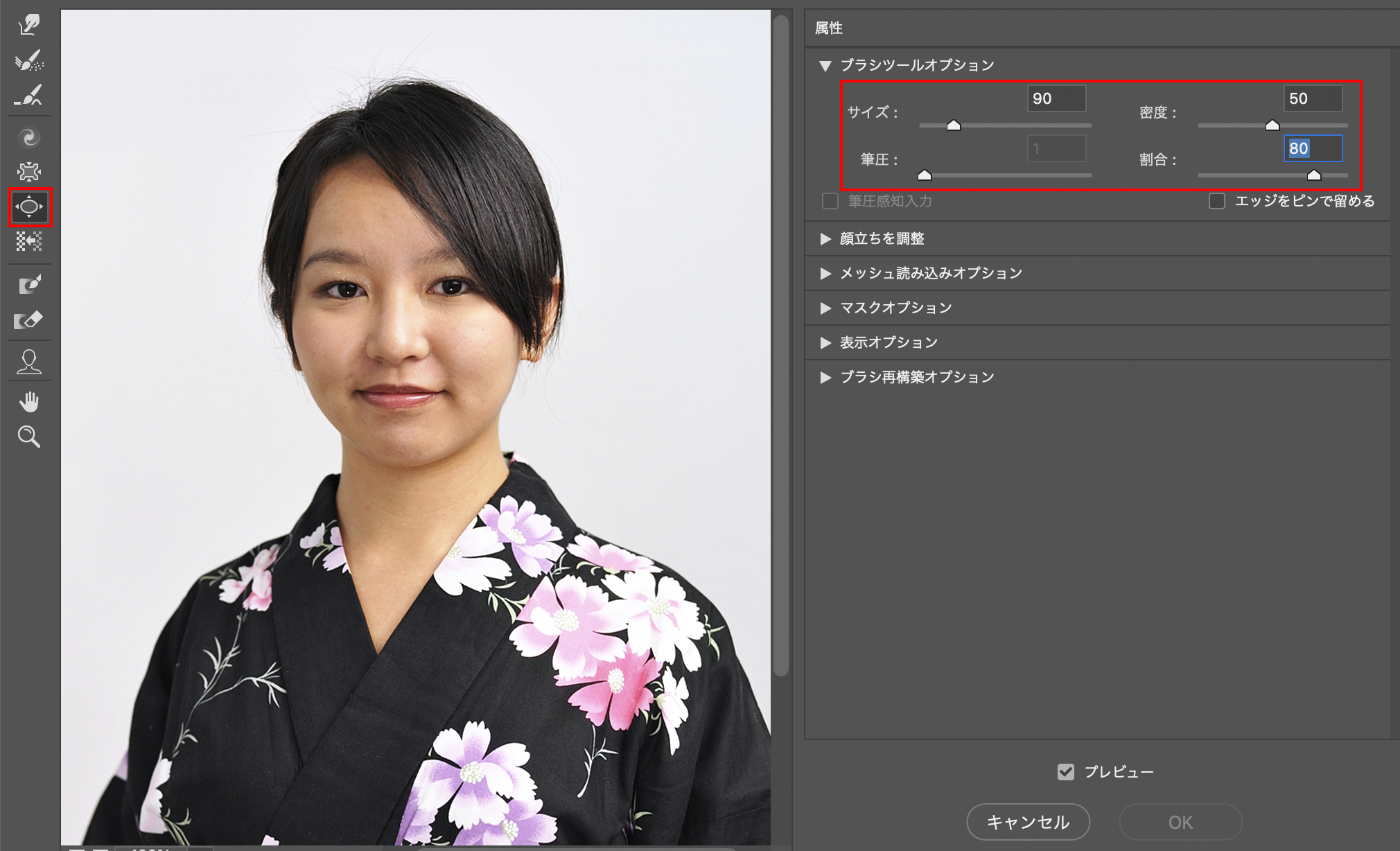 次にフィルターメニュー→“ゆがみ...”を選択。表示されたワークスペースの左側のアイコンから「膨張ツール」を選択し、ここでは[ブラシツールオプション]の設定を[サイズ:90][密度:50][割合:80]にしました(図4)。