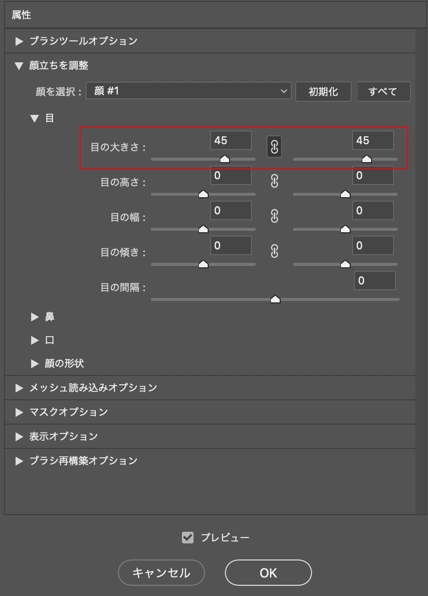 そのほか目の高さや幅など細かな設定も可能です。同様の手順で鼻や口など他の顔のパーツも調整できます。