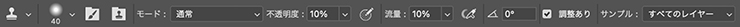 コピースタンプツールで目の下の影を薄くしていきます。新規レイヤーを作成したら、ツールパネルでコピースタンプツールを選択して(図2)、オプションバーのブラシの設定を[硬さ:10%][不透明度:10%][流用:10%][サンプル:すべてのレイヤー]にします(図3)。ブラシサイズは適宜変更しながら調整しましょう。
