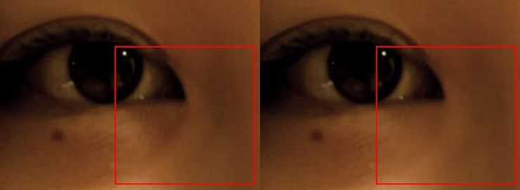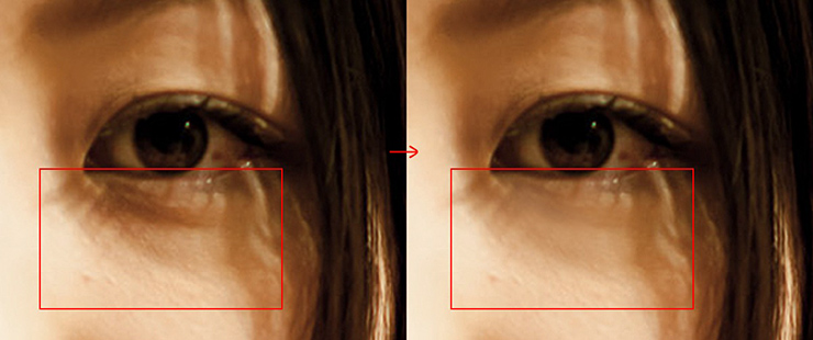続いてポインターをコピー元(影の入ってない箇所や影の薄い箇所)に合わせ、Optionキーを押しながらクリックして(図4)、目の下の影などに塗り重ねる様にドラッグして影を薄くしていきます(図5)(図6)。