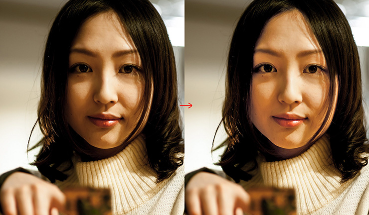 さらにブラシツールを選んで[描画色]を白に設定して、顔の上をドラッグします。これで顔だけを明るくすることができました(図10)(図11)。目など明る過ぎる部分は、[描画色]を黒に設定して再びマスクすれば部位ごとの明るさ調整も可能です。
