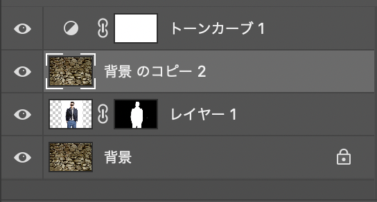 続いてレイヤーパネル上で背景レイヤーを選択した状態でCommand+J(WinはCtrl+J)で複製し、人物レイヤーの前面(上)に配置します(図11)。